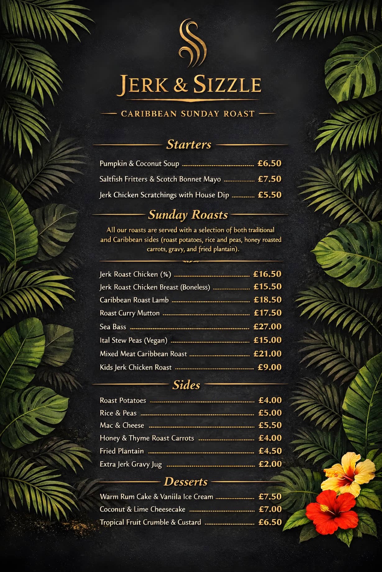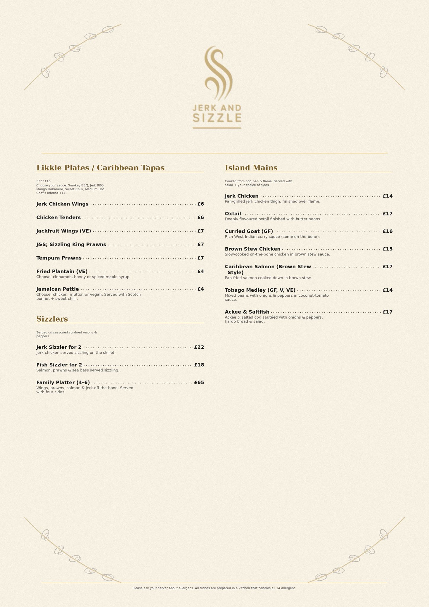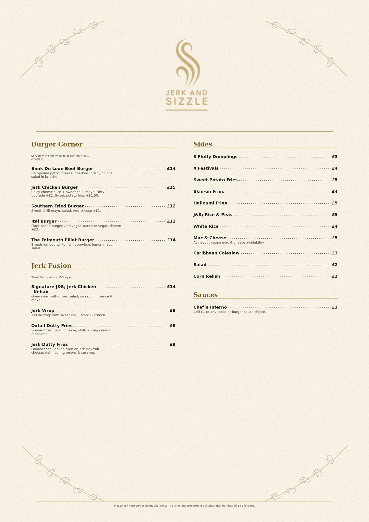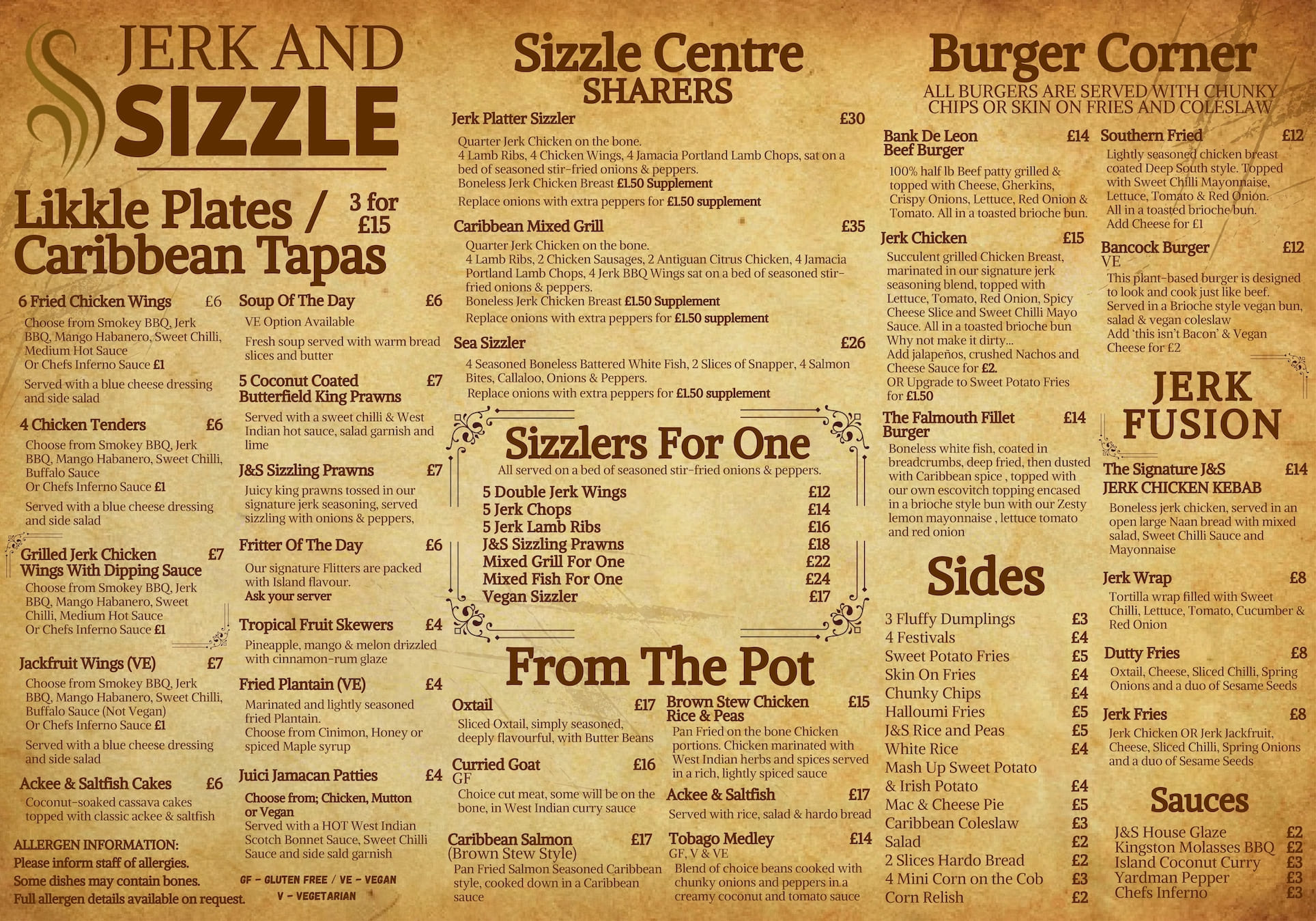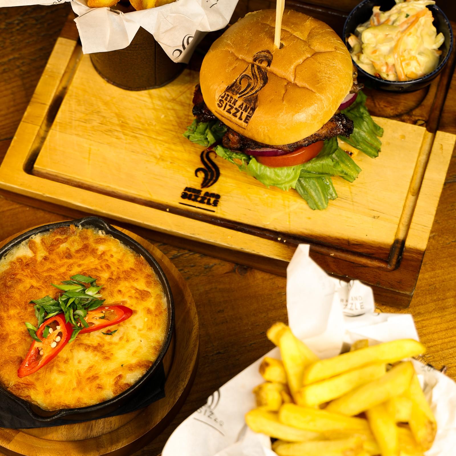 Our menu is packed with bold flavours, easy-going vibes, and dishes that will make you feel at home. Whether you're grabbing a quick bite or settling in for an evening of food and fun, Jerk and Sizzle is your new destination for something different, something delicious, and something that feels like family.